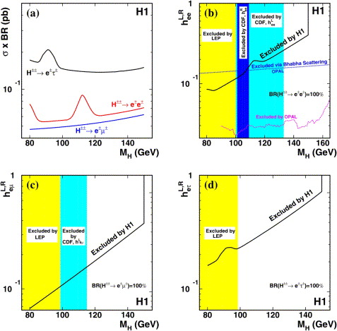If the doubly-charged Higgs boson couples only to an electron pair (Figure b) this analysis rules out H北 masses below 138 GeV for a coupling hee of the electromagnetic strength, hee ~ 0.3. The result is compared to the bounds obtained from searches for H北 pair production at LEP and by the CDF experiment, and to both the indirect and direct limits obtained by the OPAL experiment, the latter being the most stringent. The OPAL experiment has also set similar stringent constraints on hee independently of the Higgs decay mode. These constraints also exclude a sizeable H北 production at HERA via hee followed by the H北 decay via hμμ or hττ, which is consistent with the non-observation of a resonance signal in the μμ and ττ final states in the present H1 data.